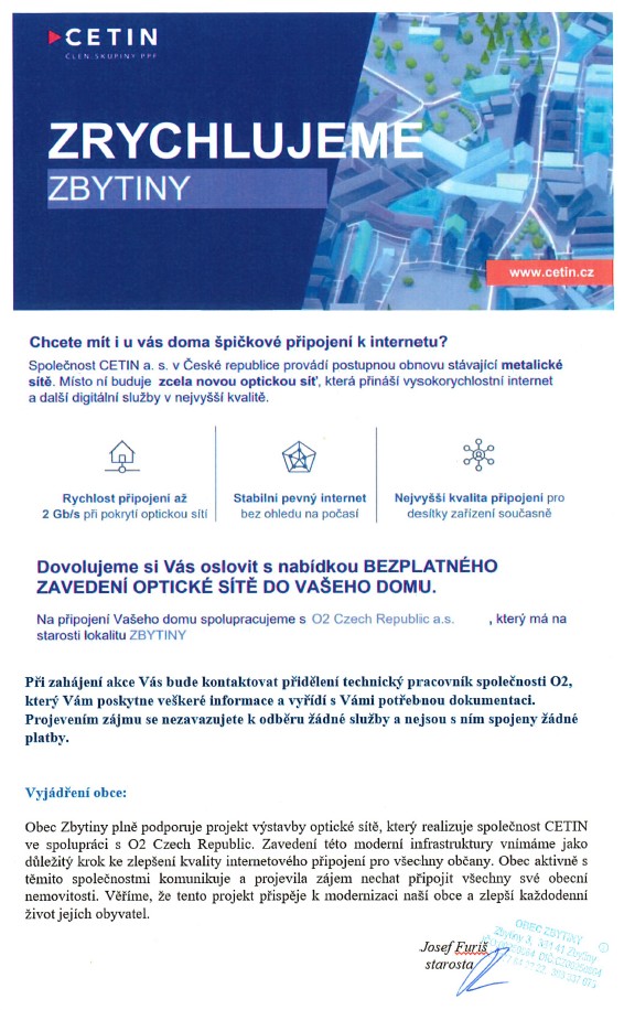 Obec Zbytiny plně podporuje projekt výstavby optické sítě, který realizuje společnost CETIN a.s. ve spolupráci s O2 Czech Republic